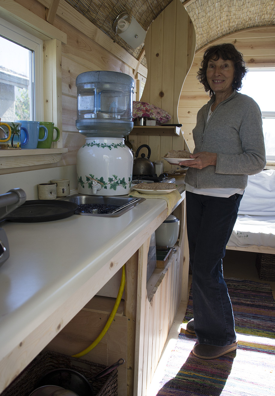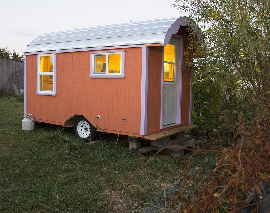 P1020450After seeing my previous tiny house perched precariously on an auto-wrecker, I decided that my next house should have wheels. I was put off by the cost of a trailer for a tiny house, but, as has often been the case, what I needed was in my own backyard. The 1964 Manorette which had housed us while we built our cob house, had served other humans as well, but its most recent occupants had been small furry people who were not concerned that the RV did not have an official bathroom.