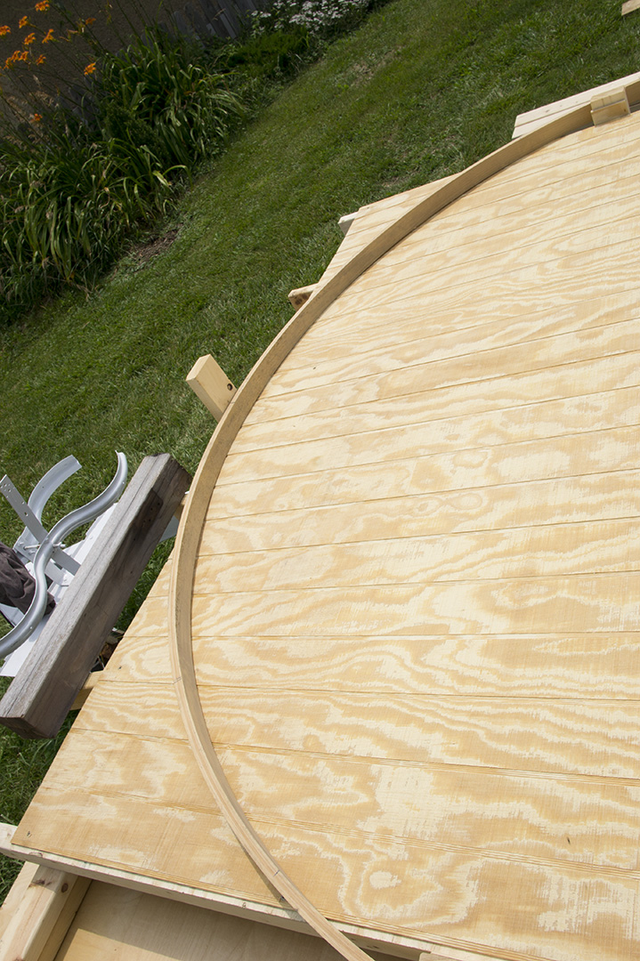 SONY DSCThe textured plywood siding became a template for the barrel vault roof. The roof is 7′ 3″ at its widest and has a 32″ rise. This worked perfectly for three sheets of standard galvanized steel roofing which is a stock item at most lumber yards. Other than the 2×4’s there is no board or plywood in this roof.